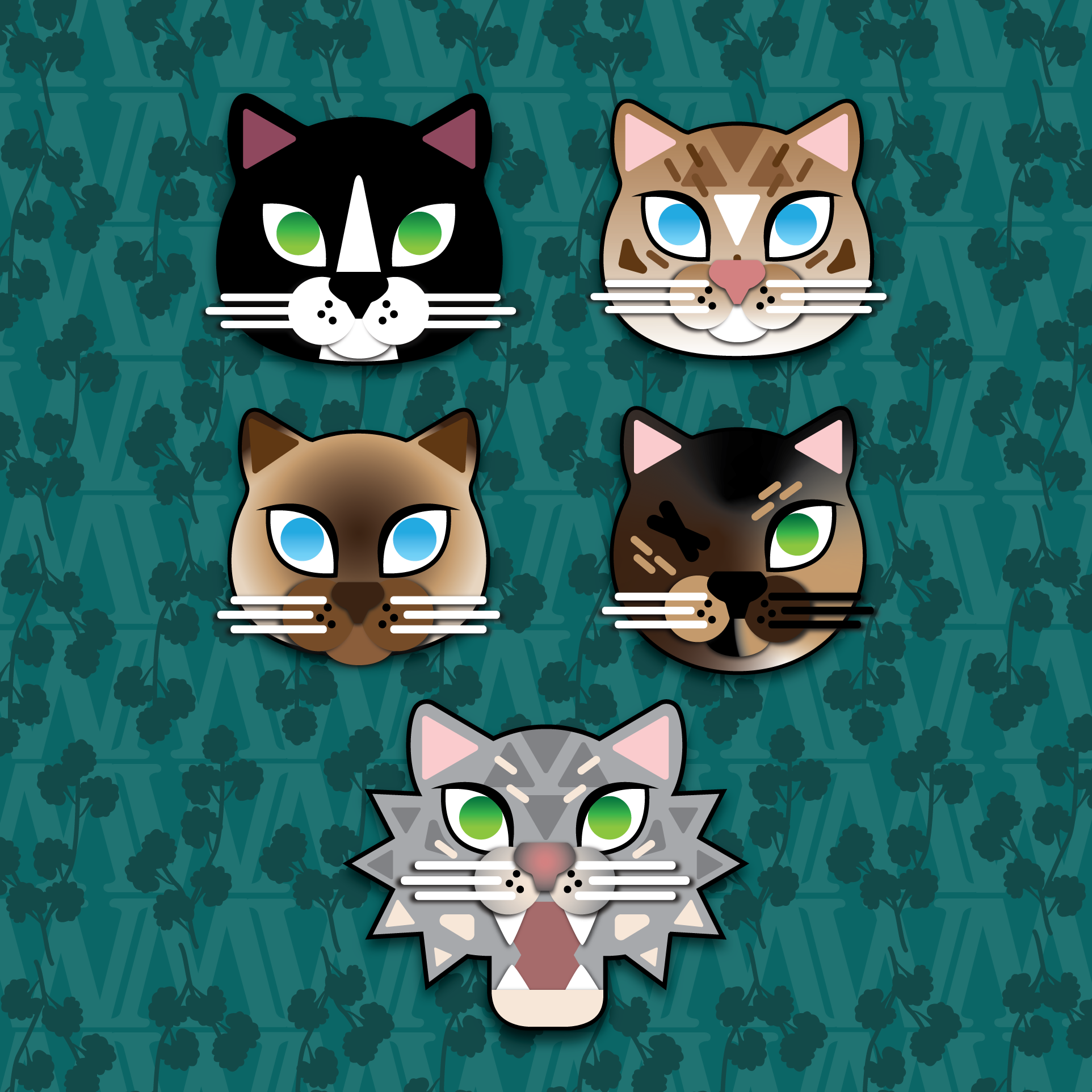 Enter: our family portrait! You’ll notice it’s all cats. We have five cats in our home, and it’s nearly impossible to get all of them together for a family photo. I’ve commissioned family portraits before, featuring other artists’ renditions of our little horde, but I’d never taken a crack at it myself. I think (and my partner agrees) that this is the best portrait of them all, perfectly showcasing our little gremlins and their idiosyncrasies. Our grey tabby is a terror, our siamese is just a little cross eyed, and our tortie sports her signature one-eyed glare. I included a few other sentimental details, including our last initial making up the lattice in the background, and gifted this piece to my partner for Christmas. It’s now one of our favorite art pieces.